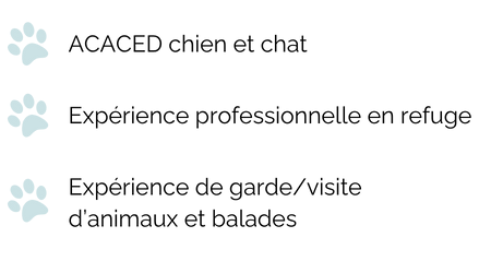 J'ai grandi aux côtés de deux chats avant de prendre mon premier matou à moi, Pimousse, qui était un Sacré de Birmanie. Ne pouvant me résoudre à vivre sans chat après son décès, j'ai accueilli quelques mois plus tard Sora, petite Ragdoll d'un an aujourd'hui. Mon amour pour les chats a toujours existé et c'est lorsque j'ai eu l'opportunité de travailler à la chatterie d'un refuge que j'ai su que j'avais trouvé ma voie. Être garante du bien être animal est devenue une évidence et je fais tout pour rendre cela possible.Je connais aujourd'hui également le bonheur d'avoir un chien puisque mon conjoint est venu accompagné de sa chienne Polly, shih-tzu/caniche de 5 ans aujourd'hui, lorsque nous avons emménagé ensemble.Mes expériences professionnelles sont variées, de l'hôtellerie au développement web en passant par l'administration d'une start-up jusqu'à la grande distribution. Rien ne m'avait autant fait vibrer que mon expérience d'agent animalier en refuge pour animaux. C'est donc à l'aube de mes 30 ans que je décide de devenir auto-entrepreneur pour vivre de ma passion.Je possède les ACACED chien et chat.